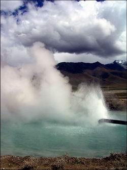 羊八井,距拉薩90多公里,過去只是一塊綠草如茵的牧場(chǎng),從地下汩汩冒出的熱水奔流不息、熱汽日夜蒸騰 。從1974年開始,國(guó)家把羊八井開發(fā)作為重點(diǎn)科技攻 關(guān)項(xiàng)目,先后撥出2億多元資金,經(jīng)過藏漢工程技術(shù)人員的艱苦創(chuàng)業(yè),豐富的地?zé)豳Y源開始被開發(fā)利用。1975年,西藏第三地質(zhì)大隊(duì)用巖心鉆在羊八井打出了我國(guó)第一口濕蒸汽井,第二年我國(guó)大陸上第一臺(tái)兆瓦級(jí)地?zé)岚l(fā)電機(jī) 組在這里成功發(fā)電,開創(chuàng)了世界中溫淺層熱儲(chǔ)資源發(fā)電的先列,進(jìn)入了工業(yè)性發(fā)電階段。