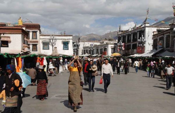 “八角街”呈圓形,仿佛是一座巨大的時(shí)鐘,輝煌壯麗的大昭寺就是鐘軸。八角街并非以街道形狀定名,而是藏語“帕廓”的音譯,意思是圍繞大昭寺(建于七世紀(jì)中葉)的街道。按西藏佛教徒的說法,以大昭寺為中心繞一周稱為“轉(zhuǎn)經(jīng)”,以示對供奉在大昭寺內(nèi)的釋迦牟尼佛之朝拜。八角街還是藏傳佛教信徒轉(zhuǎn)經(jīng)的最主要的線路,每天都有磕著三步等身長頭的人來到這里。他們到大昭寺前朝拜佛祖,在光滑發(fā)亮的石塊道上投下了一道道長長短短的影子。