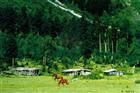 至今,信奉苯教的當?shù)匕傩赵谶@座神山上依然存有大石崇拜、神鳥崇拜和天梯(聳立在神山上的一棵巨樹,因常有霧氣鐐繞,看似高聳入云,是苯教傳說中宇宙通天樹,早夭的孩童被裝入箱內(nèi)葬于該樹的分權之間,認為這樣可使靈魂升天),這棵被視為天梯的樹上掛著各色經(jīng)幡和祭品。